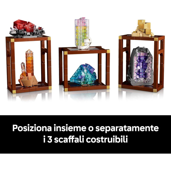 Utilizzando tecniche di costruzione intelligenti e mattoncini LEGO trasparenti, è possibile creare modelli di pirite dorata, ametista viola, fluorite blu, tormalina rossa, rodocrosite rosata e quarzo arancione. Assembla i 3 scaffali e fissa le tue creazioni ai ripiani. Disponi le unità a tuo piacimento e cambia i minerali su ripiani per variare la tua esposizione.