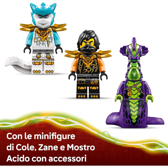 - 3 MINIFIGURE NINJAGO®: questo set con mech LEGO® include Cole con un martello, drago Zane con una spada e un Mostro Acido con un bastone per consentire ai fan di ricreare battaglie tra il bene e il male