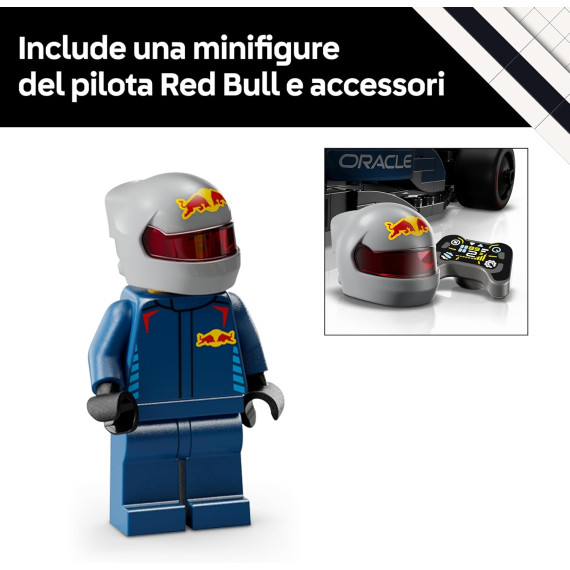 - Minifigure di F1®: il kit del veicolo include una minifigure di un pilota di F1 con tuta Red Bull e casco con ala posizionabile all’interno dell’abitacolo della monoposto di F1