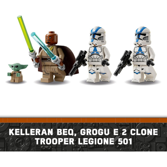 - 3 minifigure LEGO® Star Wars™ più Grogu: Kelleran Beq con spade laser blu e verdi e 2 Trooper Legione 501, ciascuno con blaster, più il personaggio LEGO di Grogu