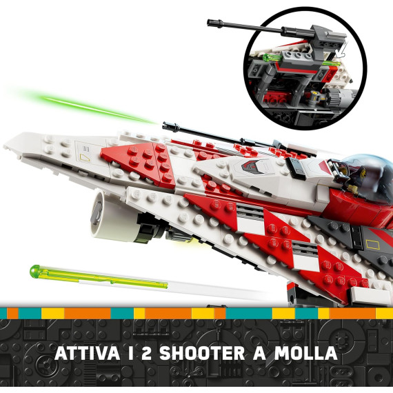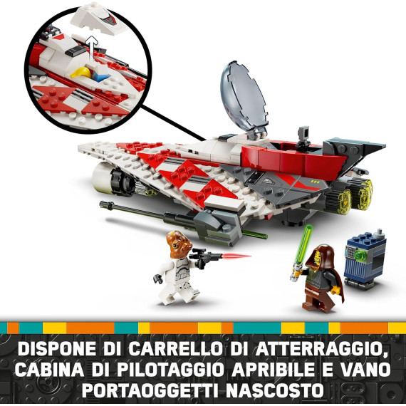 - Caccia stellare Jedi Star Wars™: l’astronave giocattolo LEGO® è dotata di cabina di pilotaggio apribile con stiva, 2 shooter a molla, clip per spade laser e carrello di atterraggio retrattile