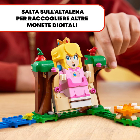 Divertiti a regalare sfide e a lanciare il Fiammetto per far cadere Lemmy da una torre. Ottieni monete digitali aiutando LEGO Peach ad andare in altalena e grazie alle interazioni con il Toad giallo. Anche il blocco ? volante offre ricompense. Se il frutto rosso di questo playset viene “mangiato” da LEGO Peach, si ottengono reazioni felici e monete extra. Il frutto può anche essere regalato al Toad giallo o a un altro personaggio interattivo (non incluso). Le istruzioni per la costruzione sono disponibili nell’app LEGO Super Mario.