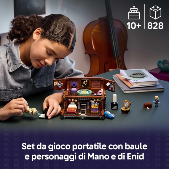 - Baule giocattolo da costruire con Mano ed Enid: Appartamento di Mano è un fantastico regalo di Halloween per i fan della serie TV Mercoledì dai 10 anni in su. Contiene 2 personaggi e un baule apribile play-and-display
