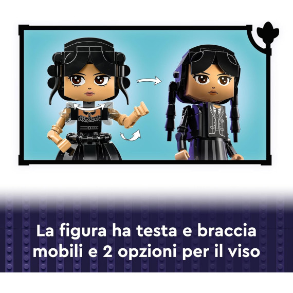 - Giocattolo di Mercoledì Addams: regala ai fan del mistero il personaggio di Mercoledì Addams, basato sul personaggio e sulla serie TV, che include un modello snodabile in mattoncini, supporto con spazio per riporre oggetti e altro ancora
