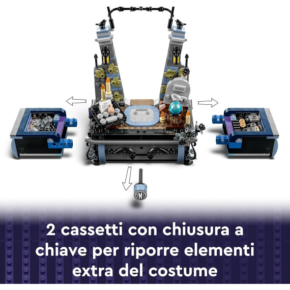 - Set di gioco misterioso con un segreto: include il personaggio di Mercoledì in mattoncini con 2 opzioni per il volto e 2 abiti, il personaggio della Mano, supporto con 2 cassetti segreti chiudibili a chiave e vari accessori