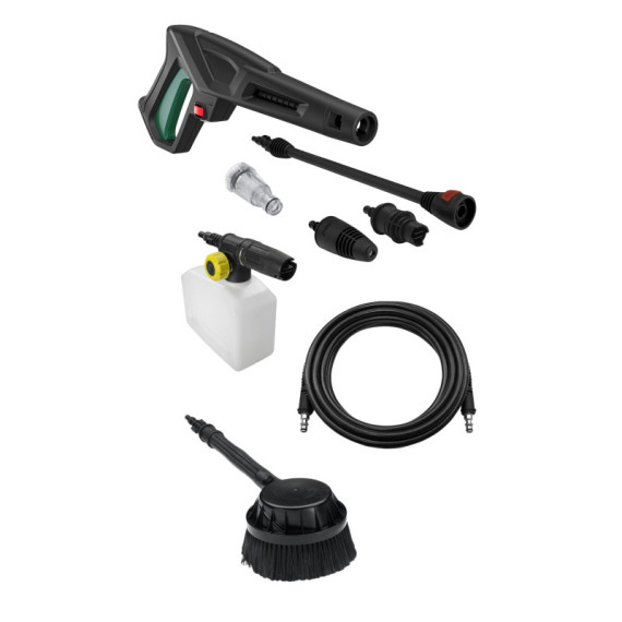 Idropulitrice ad acqua fredda con testata in alluminio a tre pistoni in acciaio ad alta resistenza con valvola by-pass incorporata. Vano portaccessori e supporto porta cavo elettrico. Interruttore ON/OFF. Tubo ad alta pressione con attacchi rapidi in pompa. Sistema schiumogeno regolabile e testina alta pressione Variojet con getto regolabile spillo/ventaglio. Maniglia telescopica e maniglia per il trasporto orizzonatle e ruote in gomma per trasporto facilitato. Potenza: 2100 W Tensione. Pressione: 150 bar max. Dimensioni: 59/88 x 39 x 36cm