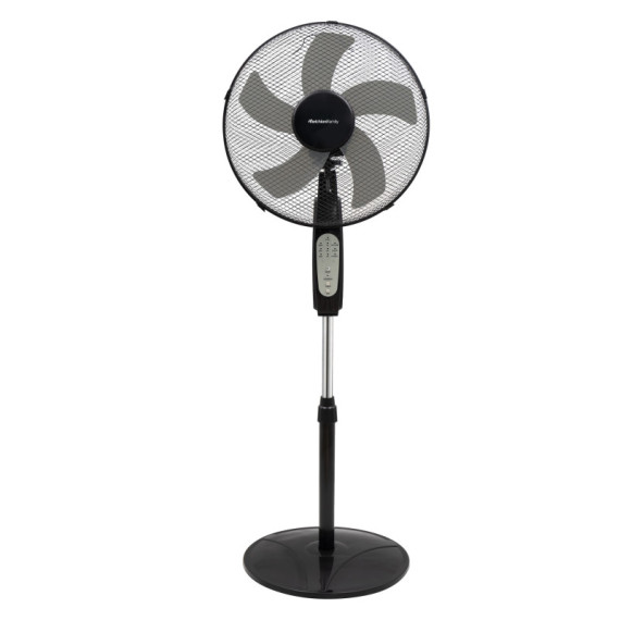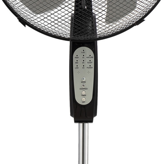 Ventilatore a piantana regolabile con telecomando e timer programmabile. 3 Velocità 5 pale, diametro 40cm Con telecomando Timer programmabile fino a 7,5h 3 modalità di funzionamento: Standard, Natura, Notte Base in metallo rotonda Tasto oscillazione Inclinazione regolabile Griglia a nido d’ape Alimentazione 220-240V/50Hz Assorbimento: 30W