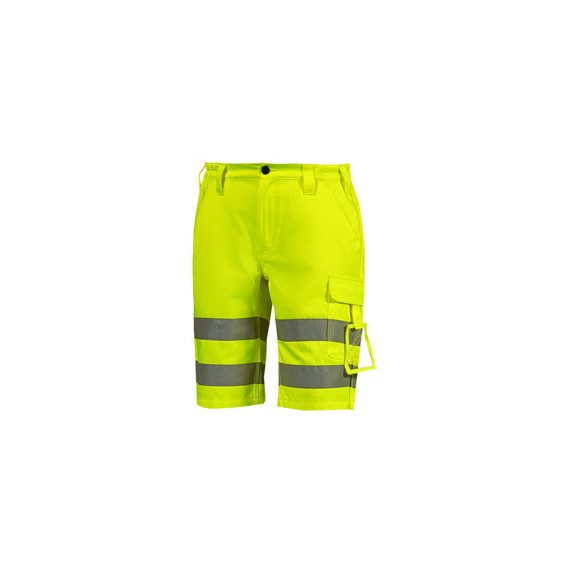 Pantaloncini realizzati in resistente tessuto cotone/poliestere 50/50, dotati di chiusura centrale con zip e bottone gommato antigraffio per un'ottima tenuta e una durata nel tempo. Rinforzi nella zona lombare, grazie al carré posteriore accentuato e triple cuciture. Inserti elasticizzati nel girovita per garantire totale libertà di movimento. 2 ampie tasche anteriori, 2 tasche posteriori con patta e velcro, 1 tasca laterale multifunzionale e 1 tasca porta-metro. Nastro reflex posizionato sul passante tubolare posteriore per migliore visibilità. Su ordinazione da S a 5XL.CE EN ISO 13688, EN ISO 20471.