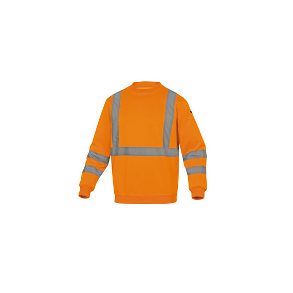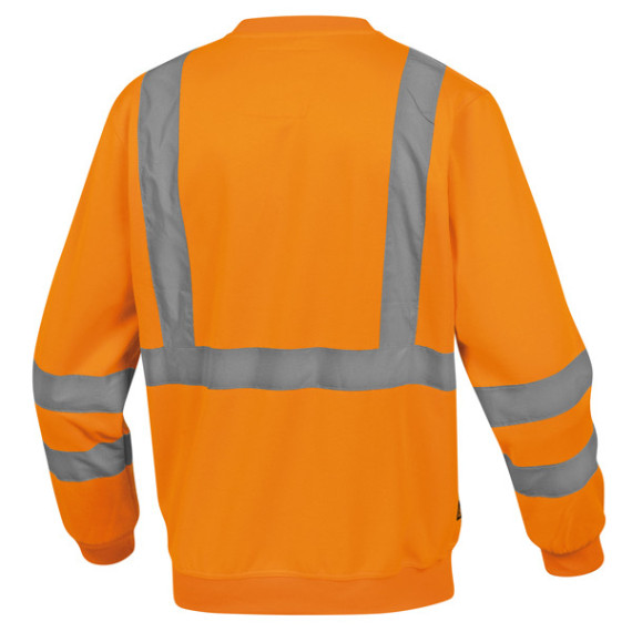 Felpa sportiva con polsini e parte bassa della felpa con bordo a coste. Bande a bretella colore argento. Colore arancio fluo. Categoria DPI: 2. Certificazione CE. Conformità alle norme EN ISO 13688:2013 e EN ISO 20471:2013 /A1:2016.