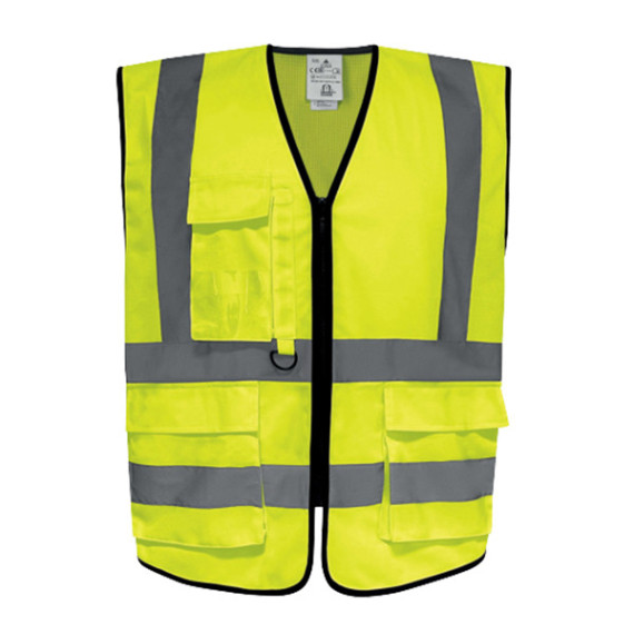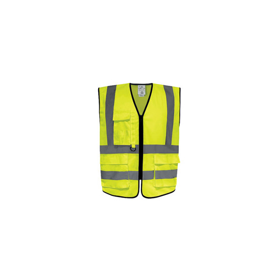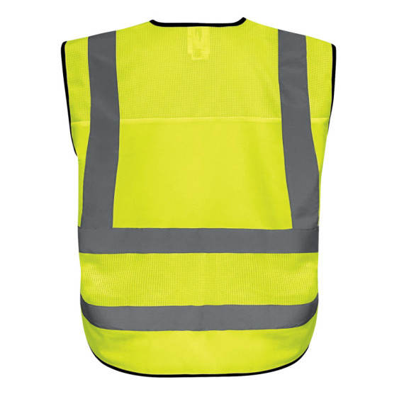 Gilet alta visibilità multitasche in tessuto a rete in 100% poliestere riciclato per il massimo trasferimento dell'umidità. 2 tasche con patta a soffietto, 1 tasca per il telefono, 1 tasca portapenne. EN ISO 20471 CE, CLASSE 2 X25 ANSI ISEA 107:2020, TYPE R - CLASSE 2, EN ISO 13688.