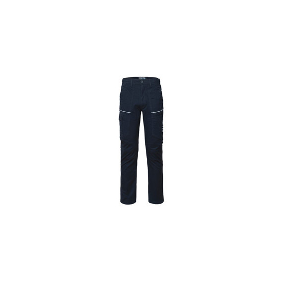 Pantalone da lavoro multitasca e multistagione in cotone twill elasticizzato, con elastici laterali e passanti in vita, chiusura con zip e bottone. Tasca laterale porta metro sulla gamba sinistra e tasca laterale chiusa con aletta e velcro su gamba destra. Triple cuciture al cavallo e pences alle ginocchia per maggior comfort. Profili orizzontali nel taglio delle tasche anteriori e 4 bande su tasca porta metro in tessuto rifrangente. Su ordinazione tutte le taglie da da S a 4XL.
