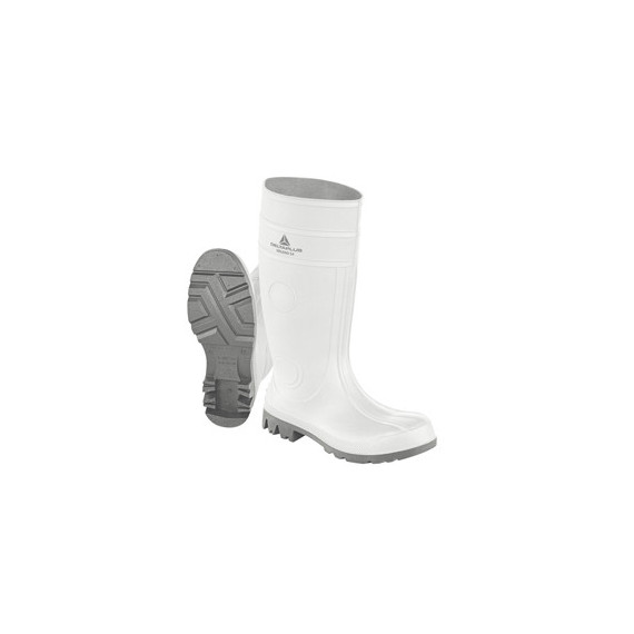 Stivale di sicurezza per settore agroalimentare con tomaia in PVC e fodera in poliestere. La suola in PVC / Nitrile, antiscivolamento. Punta resistente agli urti. Antistatico. Colore bianco. Categoria DPI: 2. Certificazione CE. Conformità alle norme EN ISO 20344:2011 e EN ISO 20345:2011.