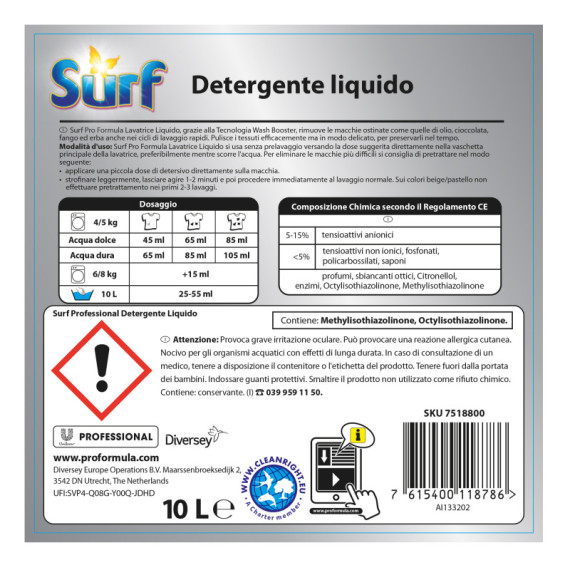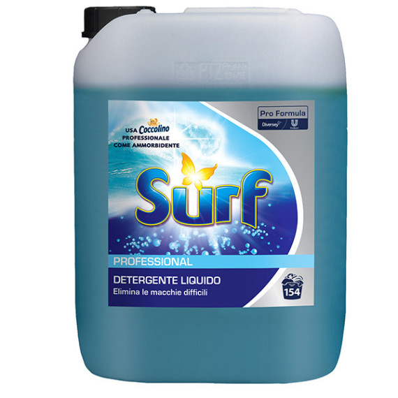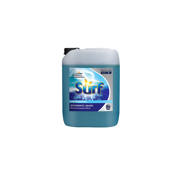 Surf liquido lavatrice detersivo professionale in tanica da 10 litri. Garantisce eccellenti risultati in ogni condizione di durezza dell'acqua. Rimuove le macchie pi¨ difficili anche a basse temperature, rispettando tessuti e colori. Nuova formula concentrata con dosaggio medio di 75ml (133 lavaggi totali).