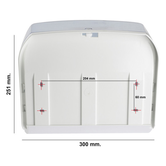 Dispenser per asciugamani in carta. Puo' contenere sia il rotolo (dimensioni massime diametro 155mm h240mm) o i fogli intercalati piegati a C o a V. Dimensioni dispenser: h251xp195xl300mm.