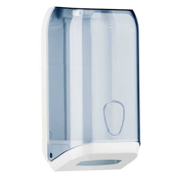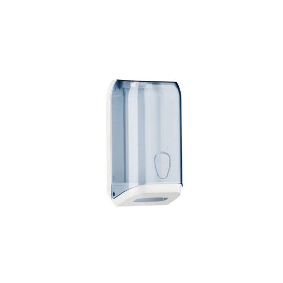 Dispenser murale per carta igienica in fogli interfogliati, capacità massima 500 foglietti. Dimensioni dispenser: 30,7x13,3x15,8cm, colore bianco/trasparente.