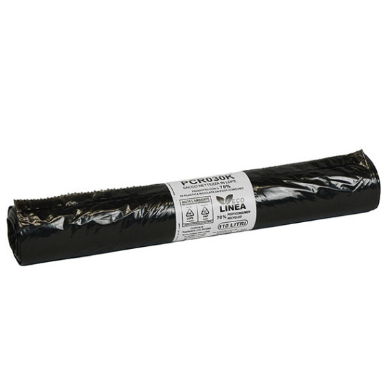 Sacchi in PCR creati con il 70% di plastica riciclata proveniente dalla racoclta differenziata domestica. Conforme alla direttiva (UE) 2018/852