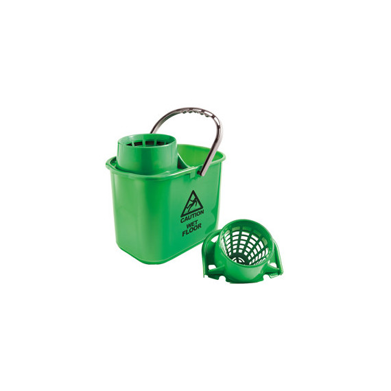 Secchio con strizzatore capacità 15L. Sistema colore per prevenire la contaminazione batterica tra diversi ambienti. Dimensioni: 30x27xH37cm.