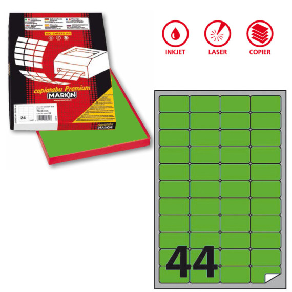 Scatola da 100fg da 21x29,7cm di etichette adesiva permanente verde fluo. Etichette con angoli tondi. Adatte per stampanti inkjet, laser e copy.