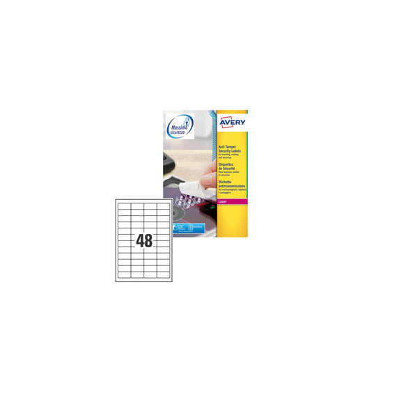Etichette bianche anti manomissione perfette da utilizzare come sigilli di sicurezza per contrassegnare un prodotto originale come autentico. Nel caso in cui si rimuove l'etichette sulla superficie appare un motivo a scacchi rendendo evidente la manomissione del prodotto. Confezione da 20 fogli nel formato A4 per stampanti laser.