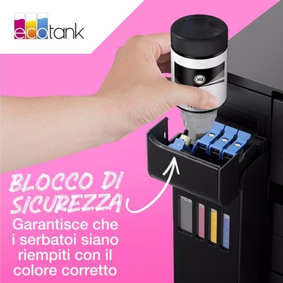 Grazie ai pratici flaconi di inchiostro richiudibili con tappo salvagoccia, riempire i serbatoi EcoTank è davvero semplicissimo. I flaconi, infatti, sono dotati di un sistema che assicura il corretto riempimento di ciascun serbatoio con il colore corrispondente.