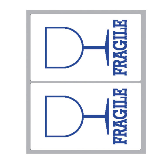 Busta da 10 fogli formato 125x152.5mm di etichette bianche permanenti con scritta FRAGILE. Ogni foglio contiene 2 etichette da 115x70mm.